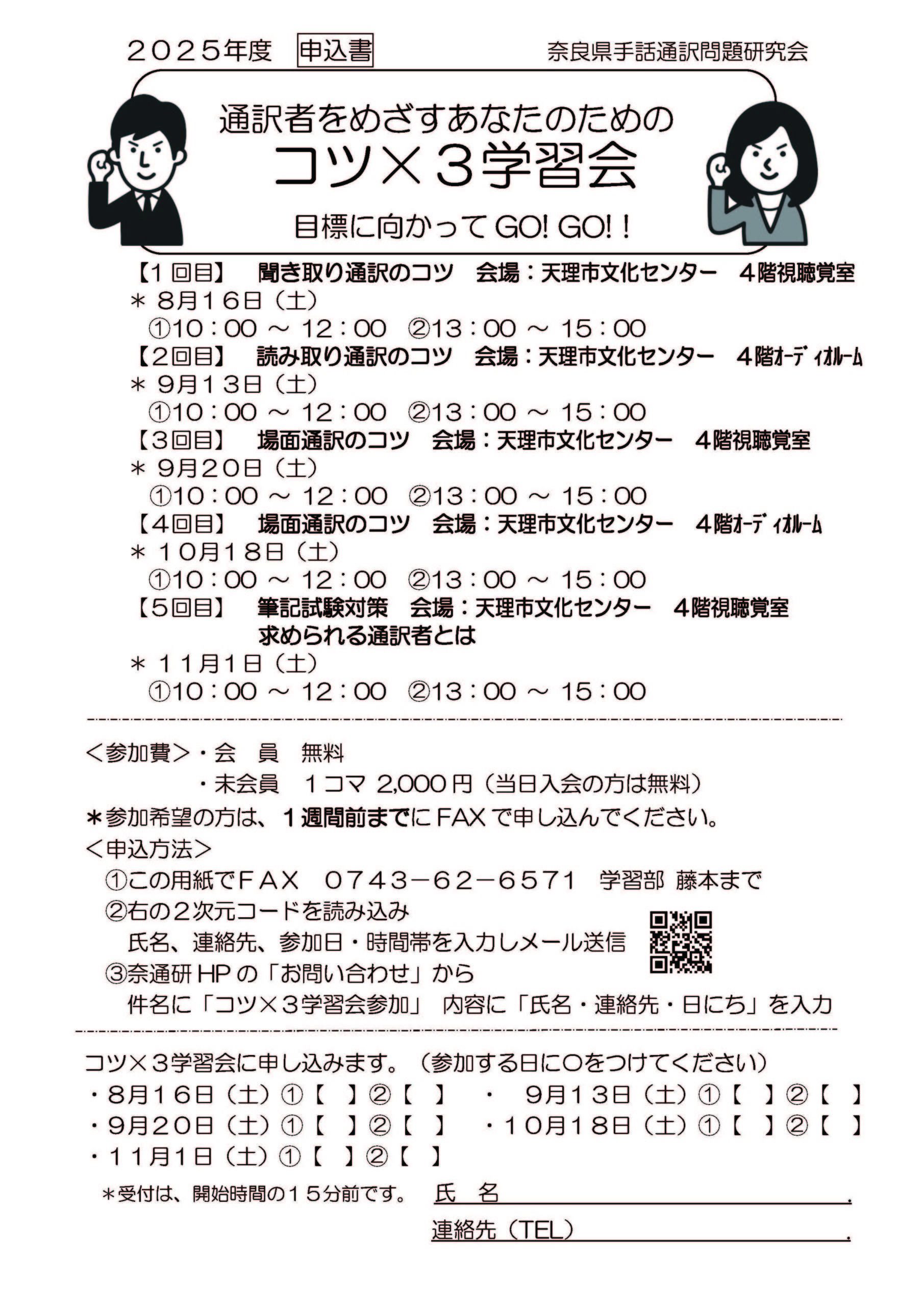 件名に「コツ×3学習会参加」 内容に「氏名・連絡先・日にち」を入力