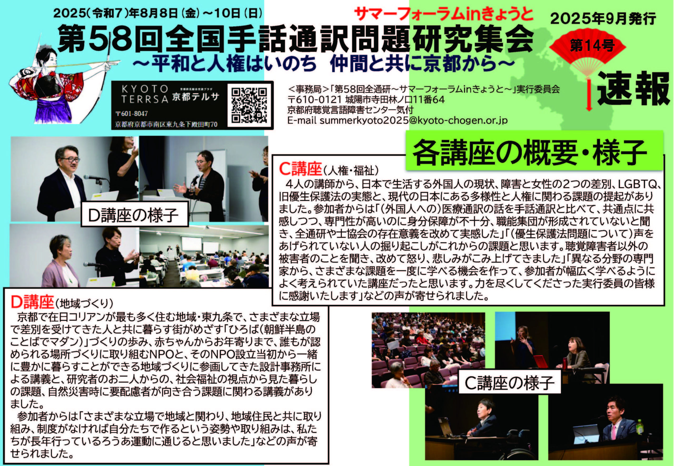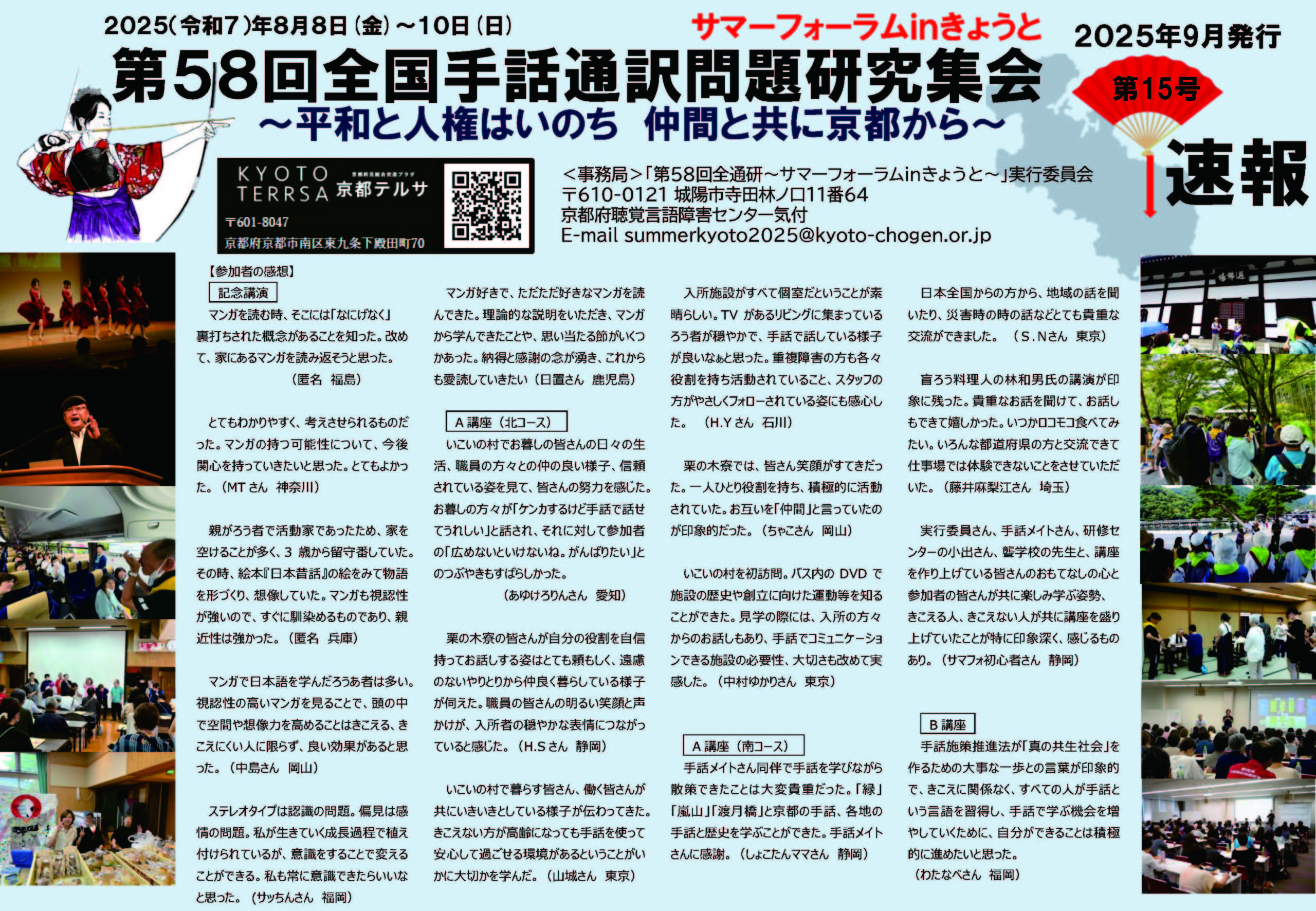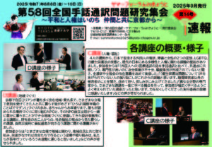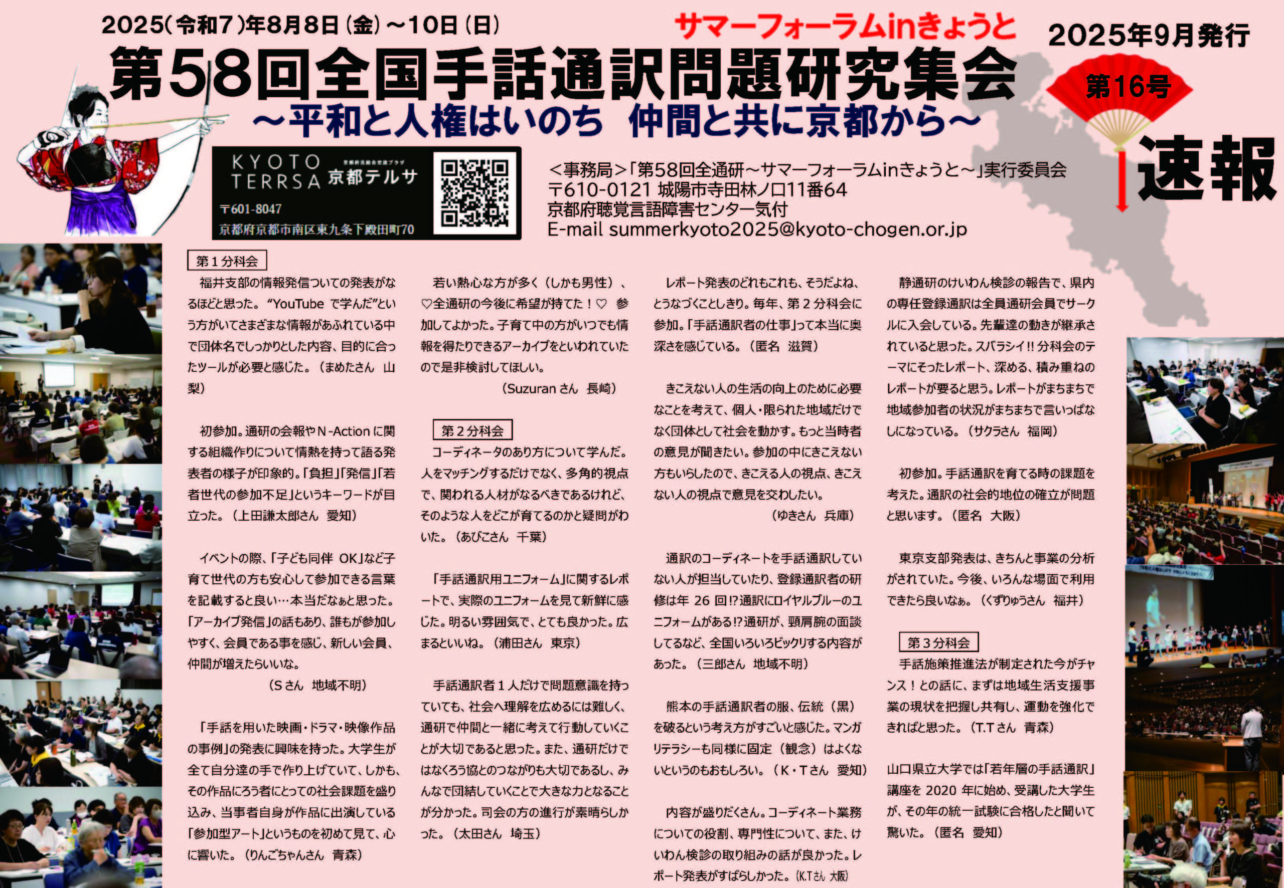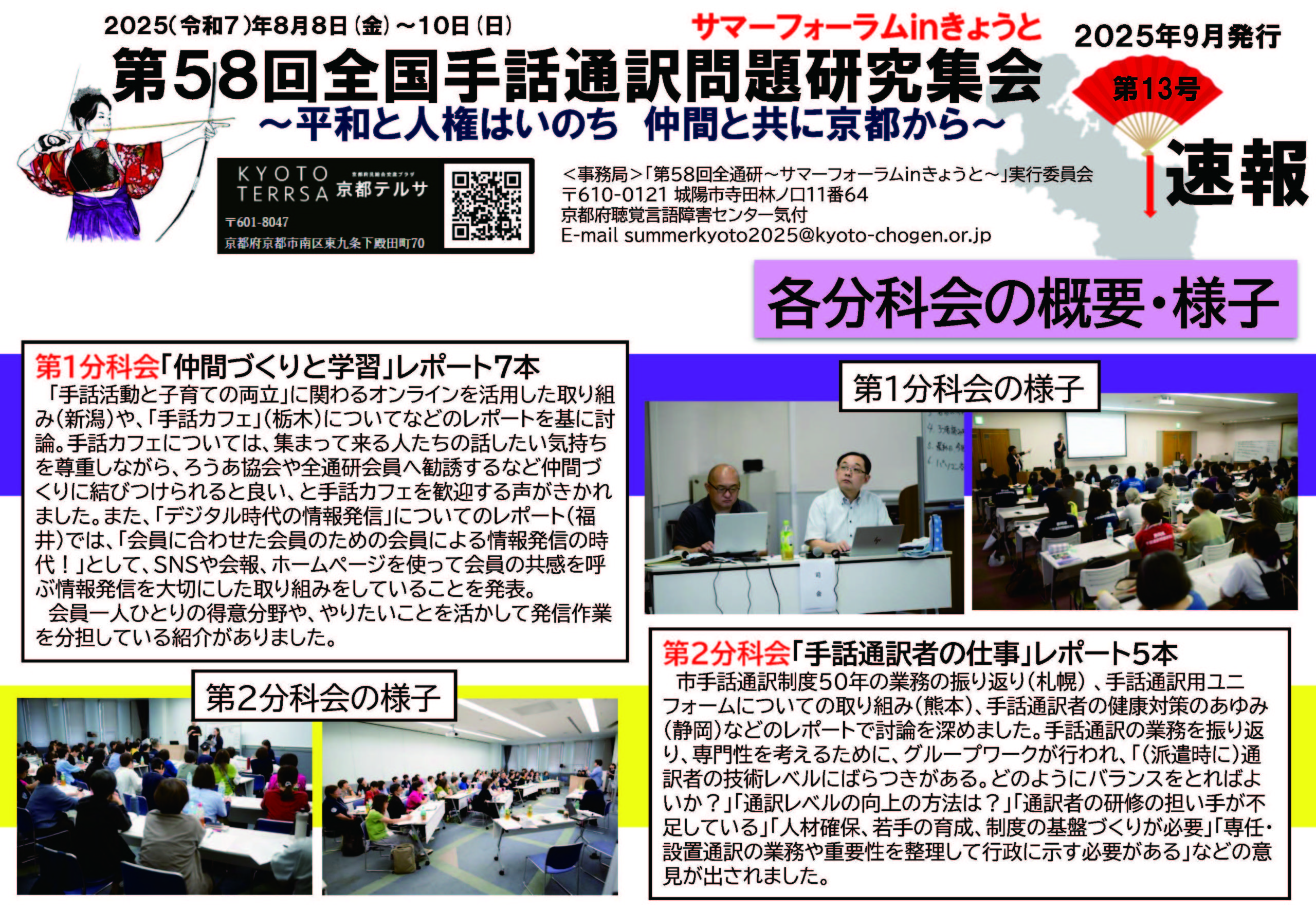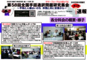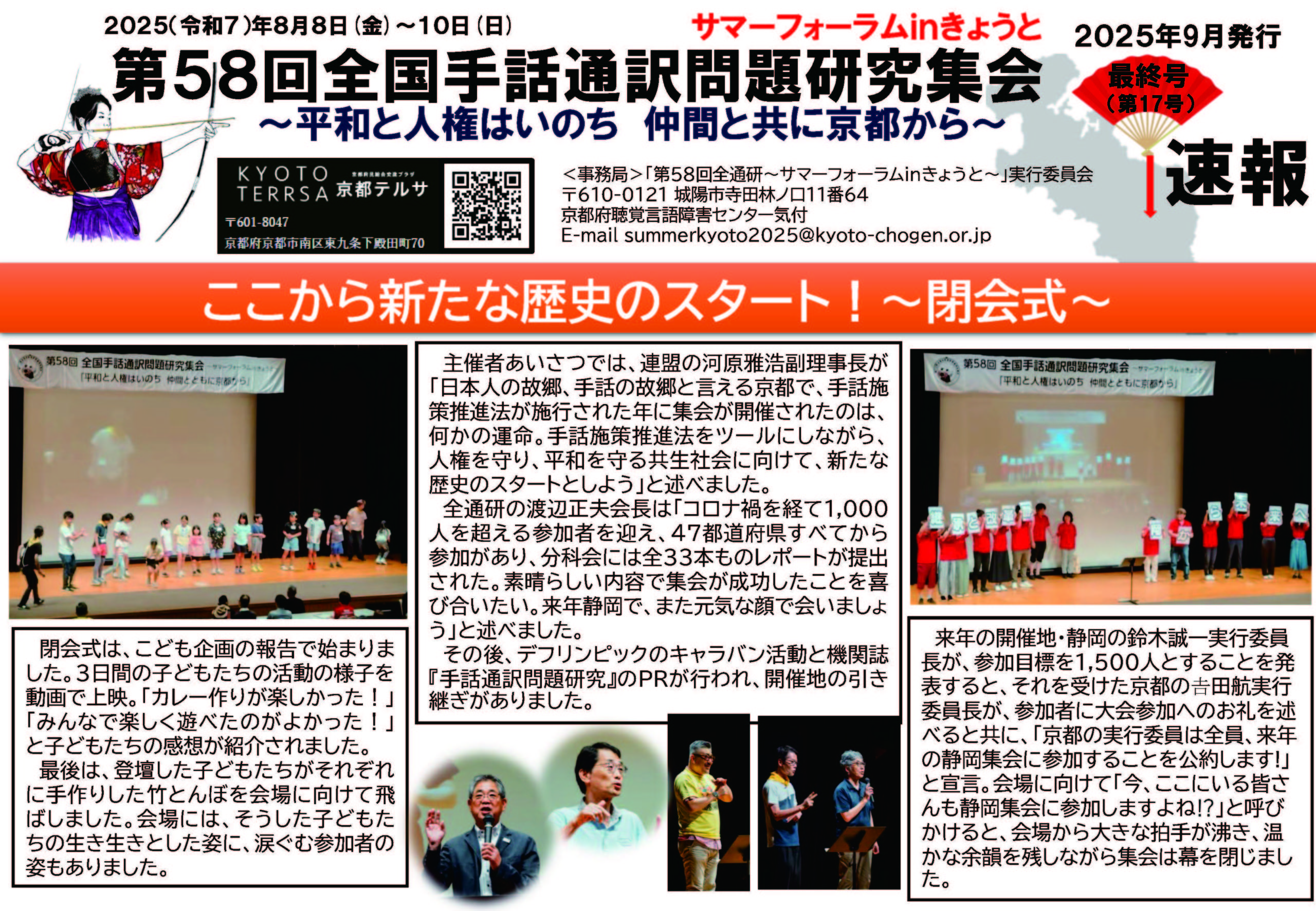 2025年9月13日 / 最終更新日時 : 2025年9月16日 奈良県手話通訳問題研究会 お知らせ 「サマーフォーラムinきょうと」速報第13号~最終号(第17号)のご案内 「サマーフォーラムinきょうと」の速報を下記からご覧いただけます。 速報第13号~最終号(第17号)です 速報第13号 速報第14号 速報第15・16号 速報最終号(第17号) FacebookXBlueskyCopy
